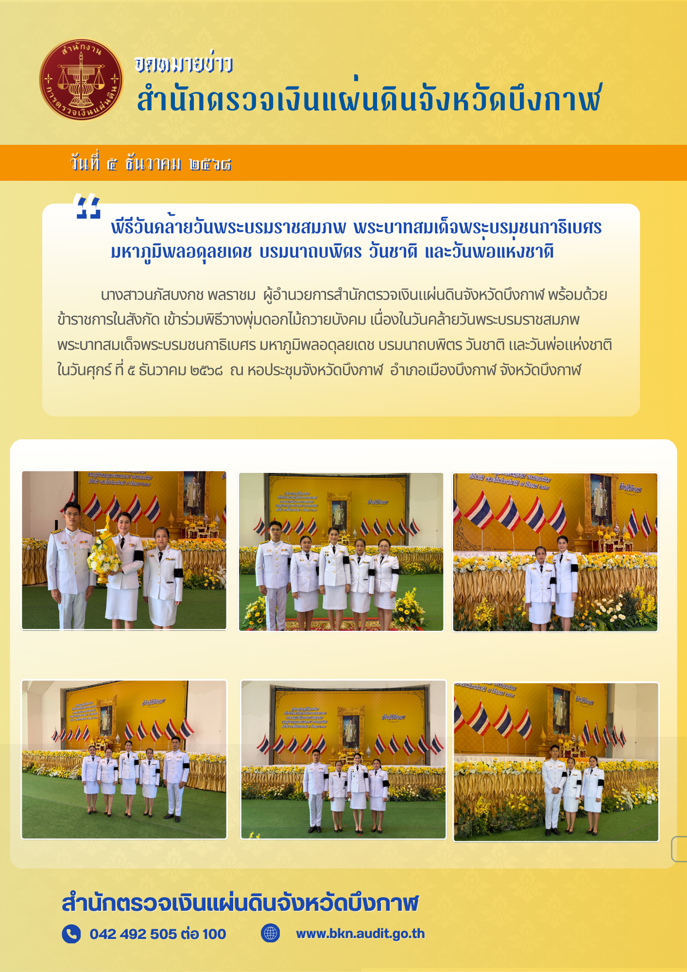 สตจ.บึงกาฬเข้าร่วมพิธีวางพุ่มดอกไม้ถวายบังคม เนื่องในวันคล้ายวันพระบรมราชสมภพ พระบาทสมเด็จพระบรมชนกาธิเบศร มหาภูมิพลอดุลยเดช บรมนาถบพิตร วันชาติ และวันพ่อแห่งชาติ 5 ธันวาคม 2568Uncategorizedธันวาคม 5, 2025ธันวาคม 12, 2025 Post Views: 213